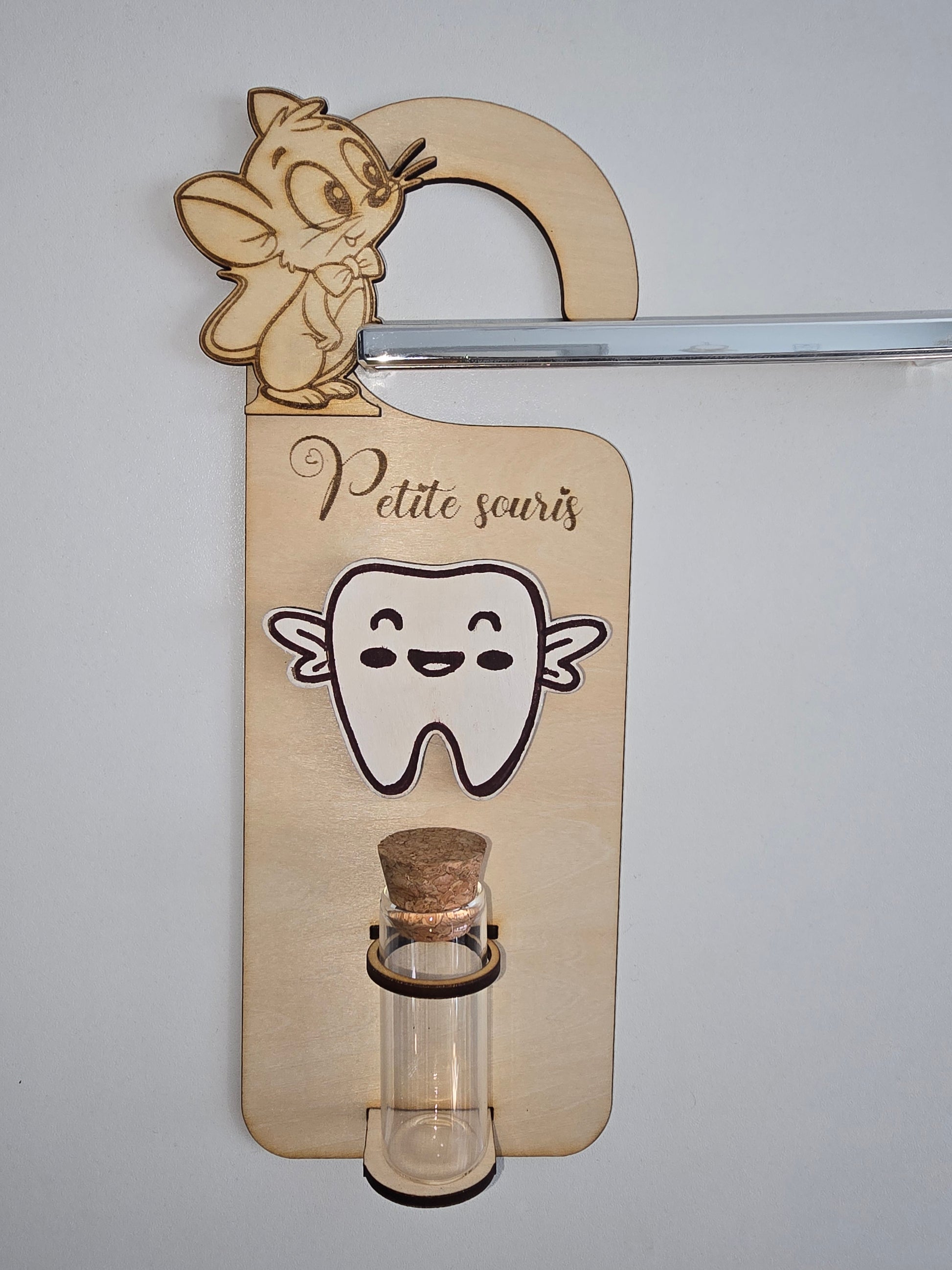 Disponible en deux versions – souris 🐭 ou fée des dents 🧚 – cette accroche devient à la fois un cadeau original et un élément de décoration unique pour la chambre d’enfant.